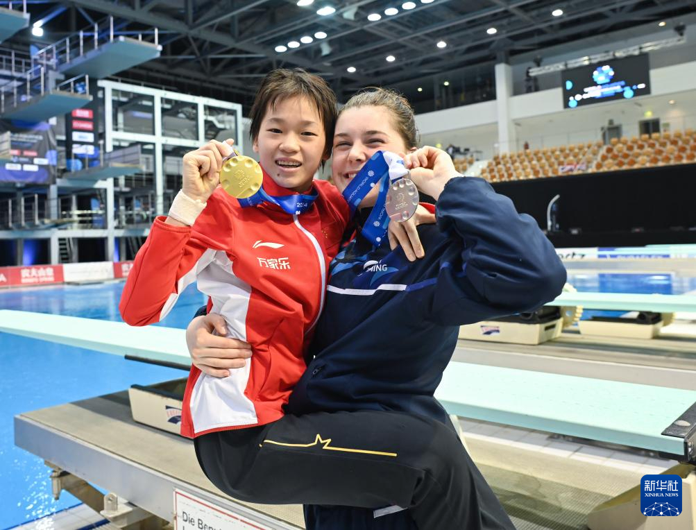 3月24日,冠军中国选手全红婵(左)和亚军英国选手斯彭多利尼·西里埃在颁奖仪式后合影。新华社记者 任鹏飞 摄