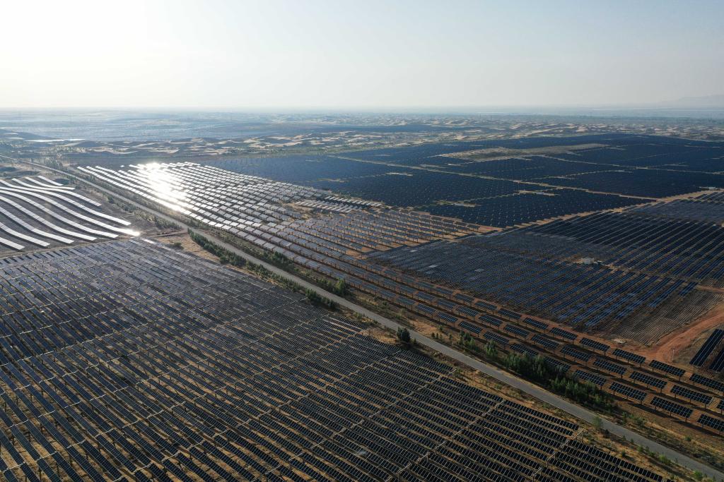 这是2024年6月5日拍摄的内蒙古鄂尔多斯市杭锦旗蒙西基地库布其200万千瓦光伏治沙项目区(无人机照片)。新华社记者 李志鹏 摄
