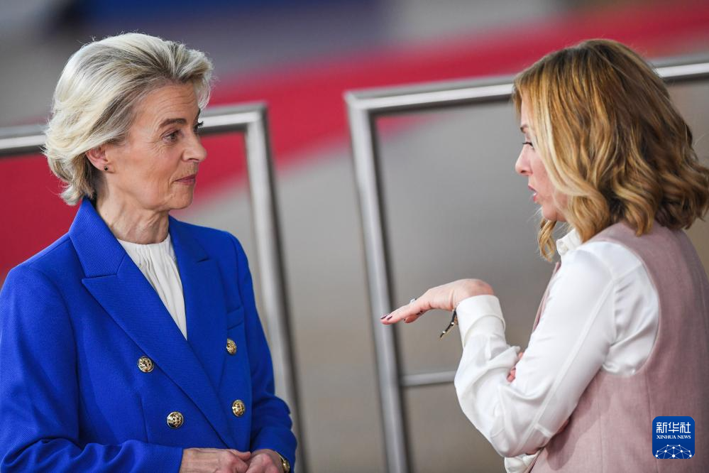 10月16日,欧盟委员会主席冯德莱恩(左)与意大利总理梅洛尼在比利时布鲁塞尔出席欧盟与海合会首届峰会时交流。新华社记者 彭子洋 摄