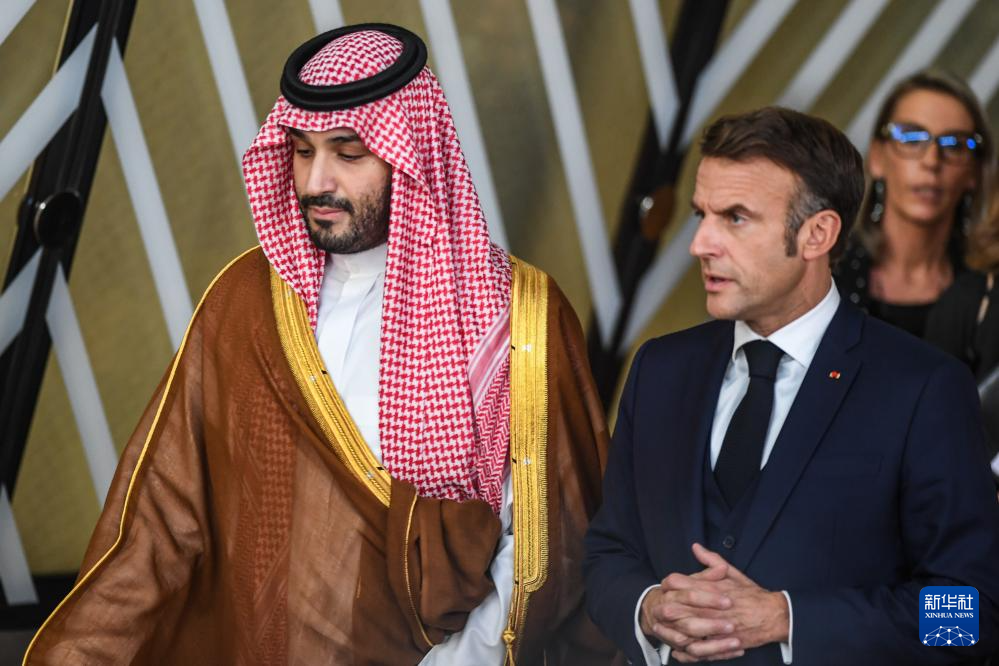 10月16日,沙特阿拉伯王储兼首相穆罕默德(左)与法国总统马克龙在比利时布鲁塞尔出席欧盟与海合会首届峰会时交流。新华社记者 彭子洋 摄