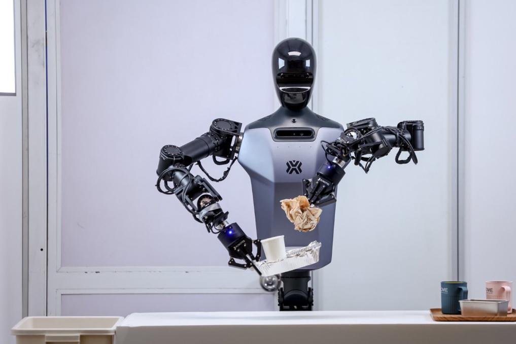 搭载“慧思开物”的人形机器人正在完成桌面清理任务。(受访者供图)