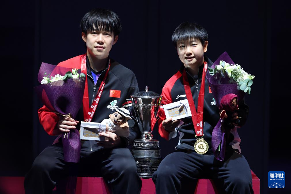 5月24日,冠军中国组合王楚钦/孙颖莎(右)在颁奖仪式上。新华社记者 刘续 摄