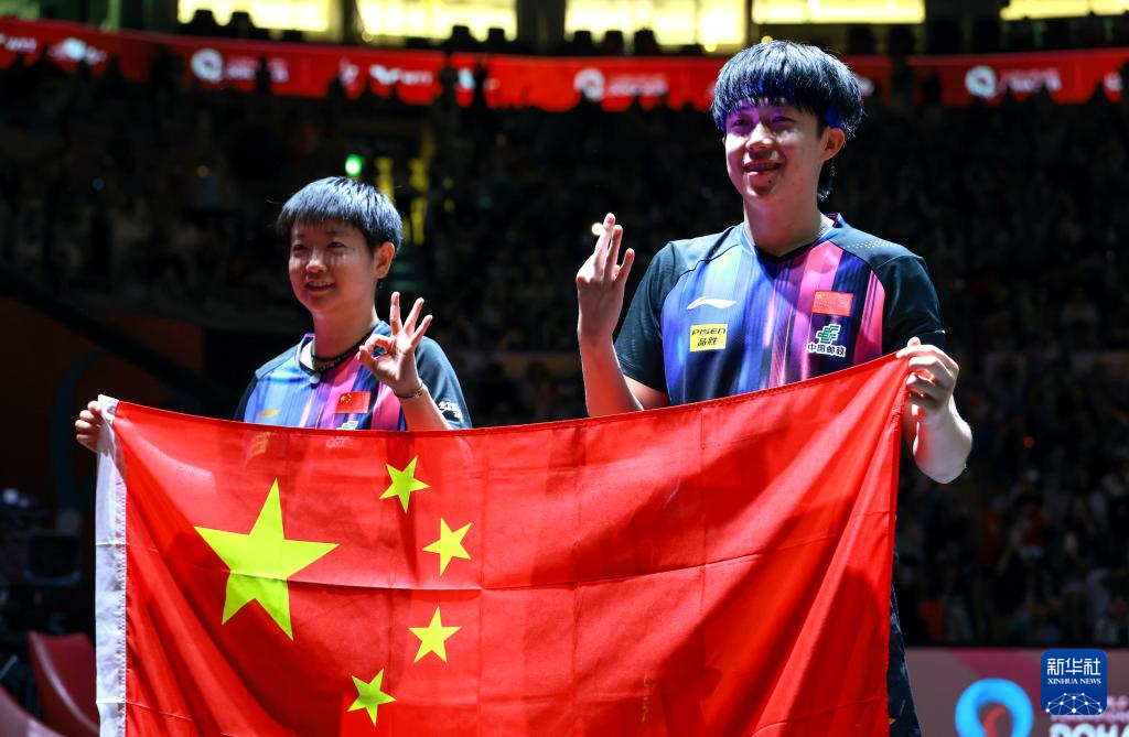 5月24日,王楚钦(左)/孙颖莎在夺冠后庆祝。新华社记者 王东震 摄