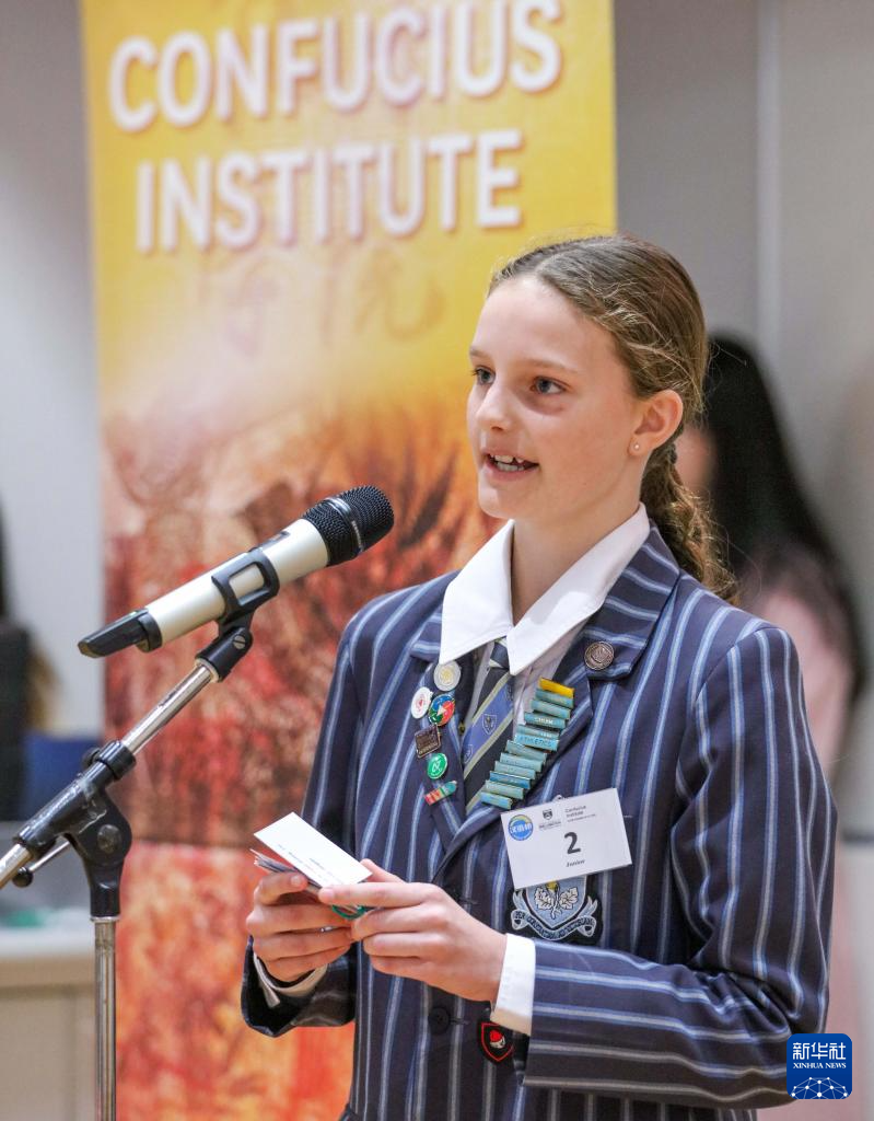 5月24日,一名选手参加在新西兰惠灵顿维多利亚大学举行的“汉语桥”中文比赛。新华社发(孟韬摄)