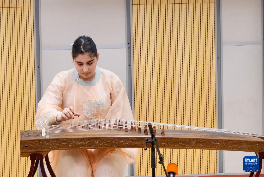 5月22日,在捷克布拉格金融管理大学举行的“汉语桥”世界大学生中文比赛捷克赛区决赛上,一名参赛选手演奏乐器。新华社记者 邓耀敏 摄