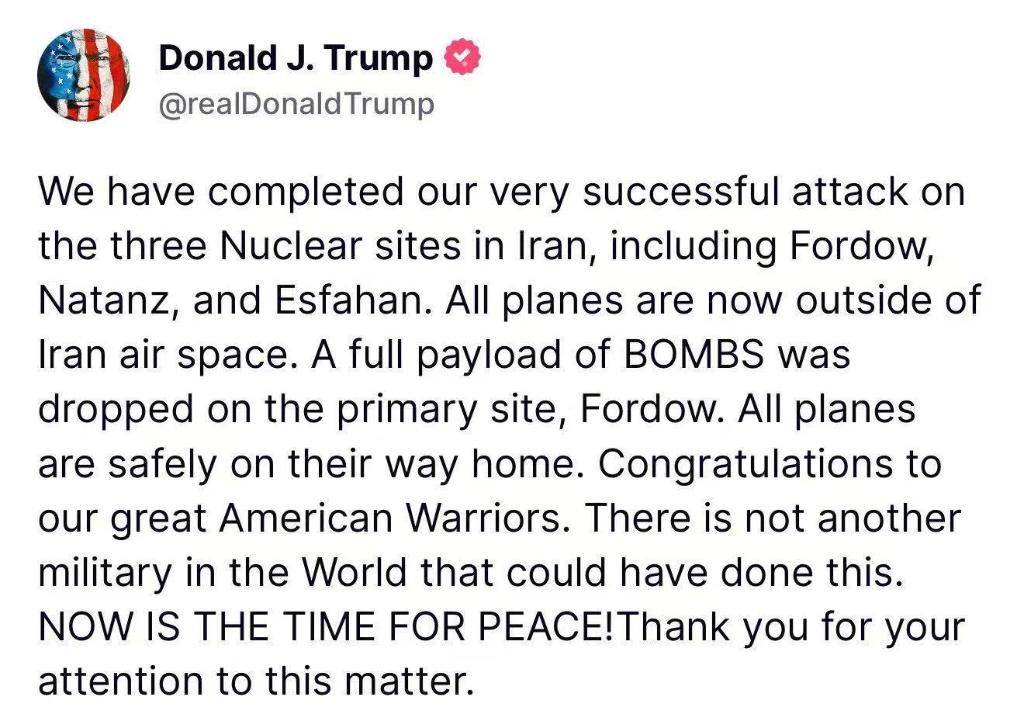 “我们非常成功地完成了对伊朗三处核设施的打击,包括福尔道、纳坦兹和伊斯法罕。所有(美军)飞机目前都已在伊朗领空之外。”特朗普在社交媒体上写道,“满载的炸弹投向首要设施——福尔道。所有飞机正在安全返航路上。”