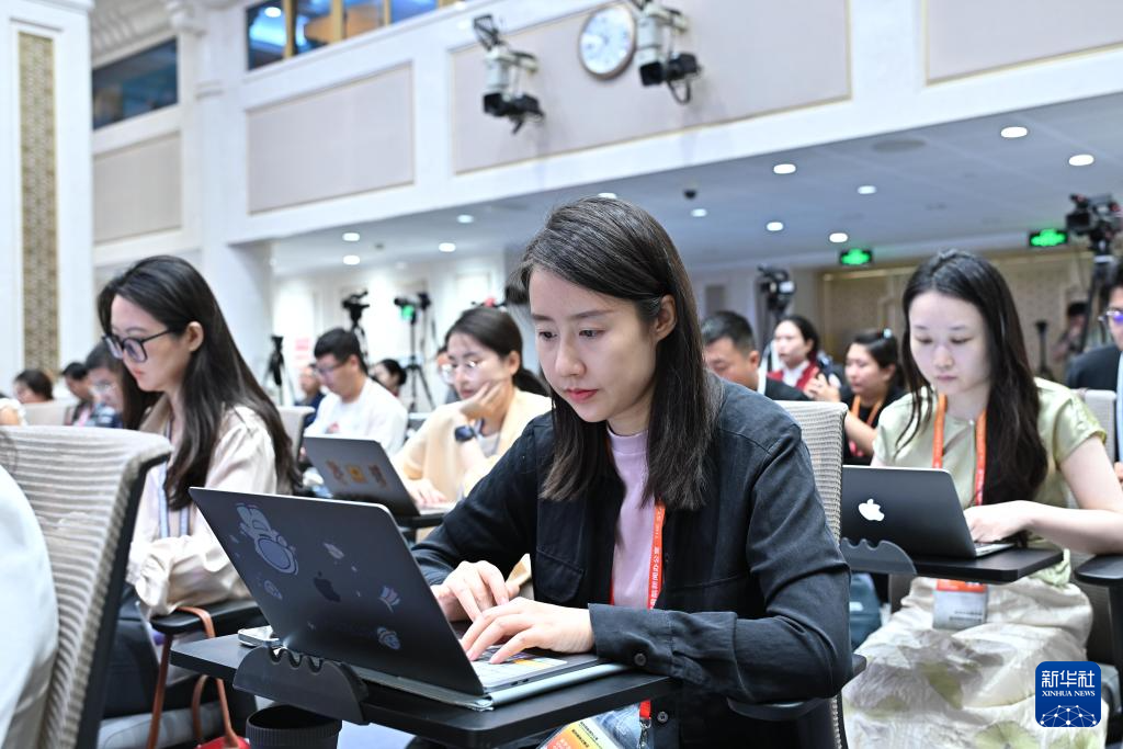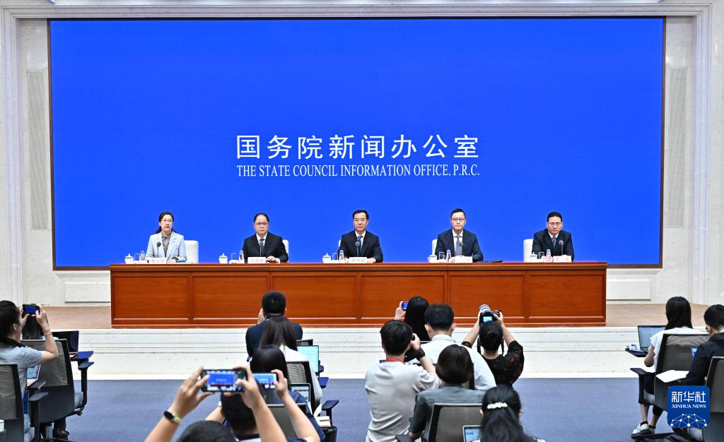 8月14日,国务院新闻办公室在北京举行“高质量完成‘十四五’规划”系列主题新闻发布会。国家发展改革委党组成员、国家数据局局长刘烈宏,国家数据局副局长沈竹林,国家数据局副局长陈荣辉,国家数据局副局长夏冰介绍“十四五”时期数字中国建设发展成就,并答记者问。这是记者在现场记录。新华社记者 李鑫 摄
