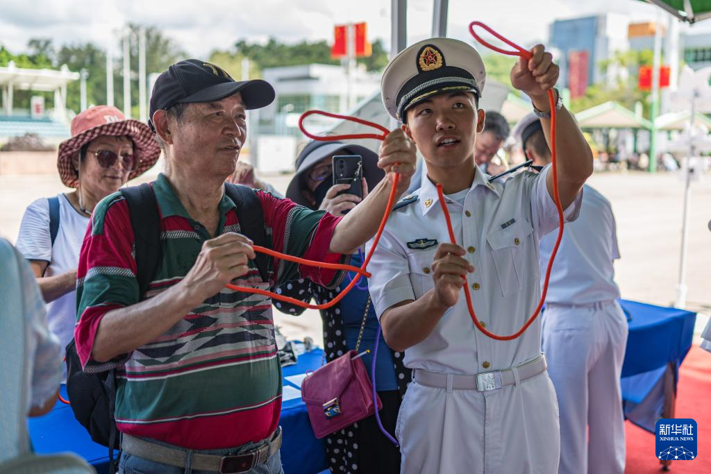 还有不少来参观的市民们对打绳结充满好奇。官兵展示“水手结”“双套结”等绳结技艺,几个孩子围着他们学习,有位小朋友在拉紧绳子时不小心打歪了,官兵便弯下身子手把手纠正,耐心讲解打法和用途。围观的市民纷纷拿出手机拍下这一温馨互动。