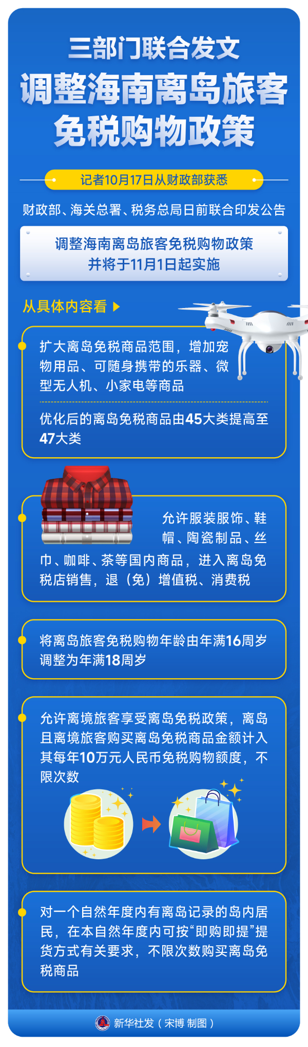 新华社北京10月17日电(记者刘开雄、申铖)记者17日从财政部获悉,财政部、海关总署、税务总局日前联合印发公告,为稳步推进海南自由贸易港建设,进一步满足消费者多元化购物需求,调整海南离岛旅客免税购物政策,并将于11月1日起实施。