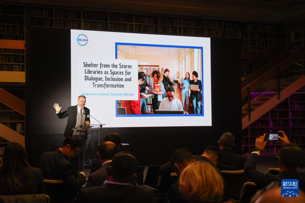 10月20日,在匈牙利首都布达佩斯,欧洲图书情报与文献协会管理局局长安德鲁·克兰菲尔德在论坛上发表演讲。新华社发(弗尔季·奥蒂洛摄)