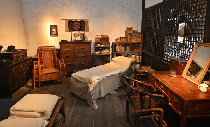 梁思成与林徽因的卧室仍按老照片复原:病榻、书籍、皮箱、竹椅、茶杯等一一在列。林徽因在李庄期间肺病加重,常卧床不起,却仍坚持学术研究,查阅资料、校阅书稿。