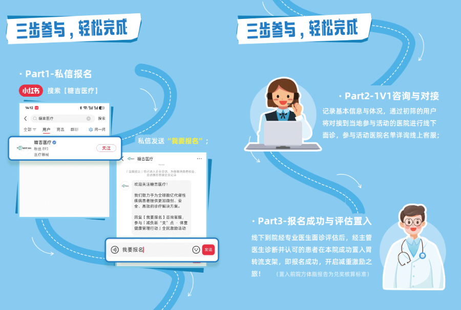 公众搜索关注“糖吉医疗”官方小红书账号,私信发送“我要报名”,即可进入1V1咨询与对接。通过初筛的用户将对接至当地参与活动的医院进行线下面诊,经专业医生评估符合条件并完成胃转流支架置入后,即为报名成功并锁定名额,正式进入挑战环节。