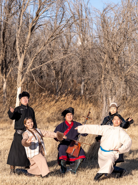 11月13日,在内蒙古锡林郭勒盟苏尼特右旗,乌兰牧骑的演员们在户外排练。马金瑞摄