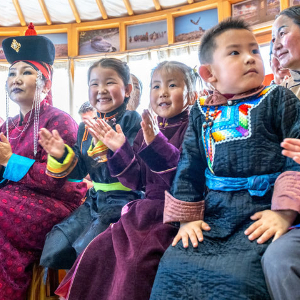 宣讲一结束,演员们马上动手,把小舞台搭起来。铺毡子、调音响、立琴架,几分钟便把一个普通的蒙古包变成了紧凑的演出空间。孩子们占据了第一排,老人靠在后面,牧民们的欢声笑语把缝隙都填得满满当当。风还在外面呼呼地叫,屋子里却已经暖烘烘了。