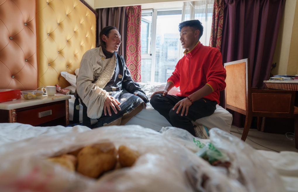 12月5日,索南加参(右)在拉萨的酒店房间中和父亲次仁多杰聊天。新华社记者 丁增尼达 摄