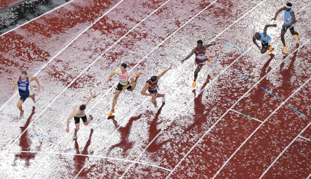2025年9月21日,田径世锦赛最后一个竞赛单元,东京突降大雨,被雨水瞬间浸湿的红色跑道上映出了选手的身影,我立刻构思画面,并在挑片工作间隙,操作遥控机器人相机对准了交接区。