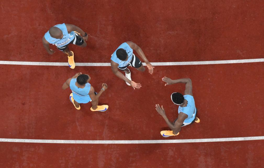2025年9月21日,博茨瓦纳队第一棒选手(右一)与第二棒选手(右二)在男子4x400米接力决赛中。