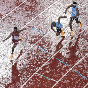 从这个画面中可以看出,当博茨瓦纳队选手已经完成了交接,而他们身边的其他队伍,第一棒选手和第二棒选手之间,仍有一定距离——博茨瓦纳队在这一次交接中,已经具有了微弱的优势。