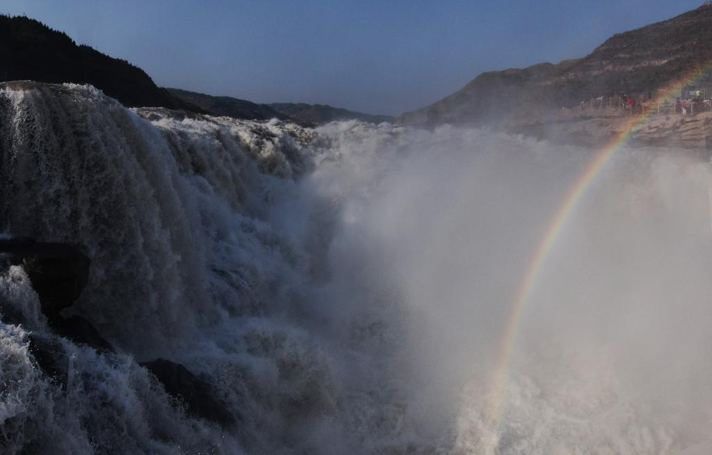 3月3日,黄河水从黄河壶口瀑布倾泻而下,水雾中,一道绚丽的彩虹清晰可见。(吕桂明 摄)