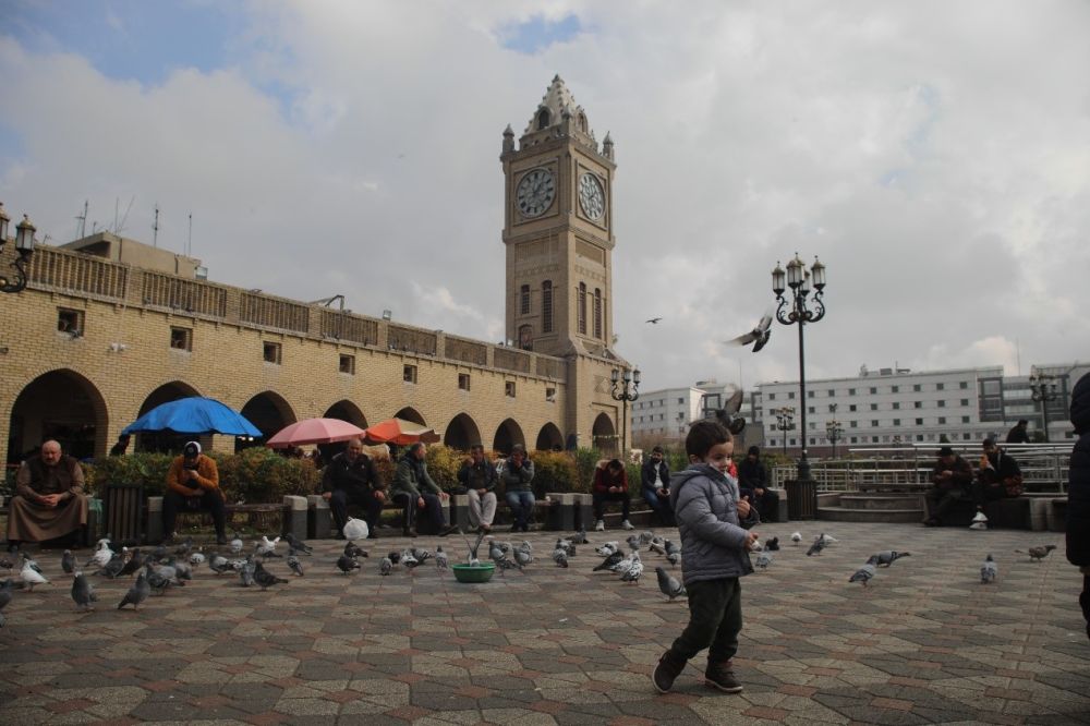 在伊拉克北部库尔德自治区(库区)首府埃尔比勒,一名男孩在广场喂鸽子。(段敏夫 摄)