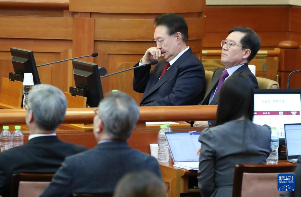 这是2025年2月20日尹锡悦(中)在韩国首尔宪法法院出席总统弹劾案庭审的资料照片。