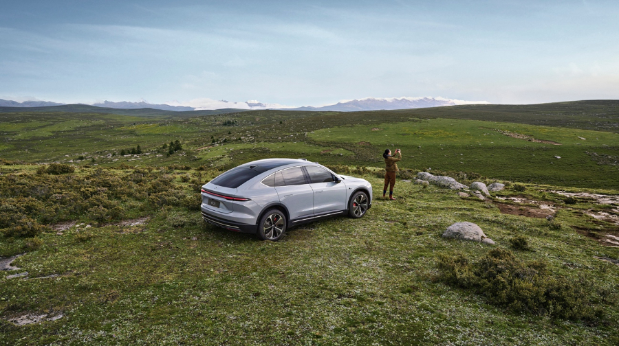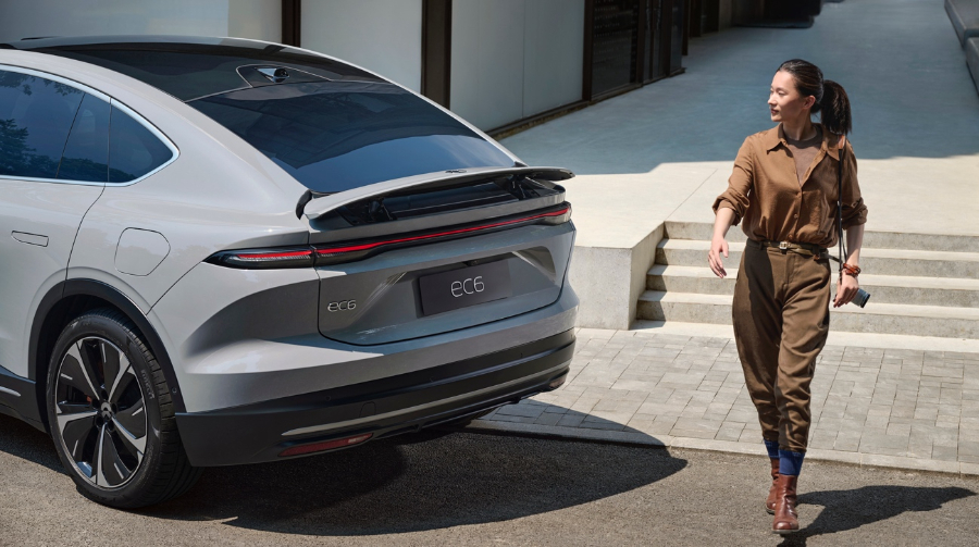 全新EC6车身长4849mm,宽1995mm,高1697mm,轴距为2915mm。新车采用轿跑溜背造型,勾勒出更具张力的车身曲线,经过反复优化的A柱倾角与更低的车身高度带来流畅且舒展的车顶流线,配合双模主动升降尾翼,风阻低至0.24Cd。尾部饱满的曲面和隆起的宽肩融合,与收窄的后风挡形成强烈的反差感。23°运动反切角设计降低了尾部的视觉厚度,让车尾更显动感。