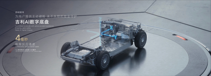 吉利自研的AI数字底盘,集中展示了自研动力底盘融合域控、线控转向、轮边电驱、智能驾驶以及AI大模型等多领域技术的跨域融合能力,具备数字底盘最高维的智驾和主动安全能力。通过AI大模型和数字底盘的完美融合,吉利汽车率先做到无人驾驶漂移。吉利AI数字底盘反应速度仅需4毫秒,比人类的极限反应速度快了25倍,可实现极限反应下的“自动控车避险”,为用户提供“主动避险、永不失控”的安全守护。