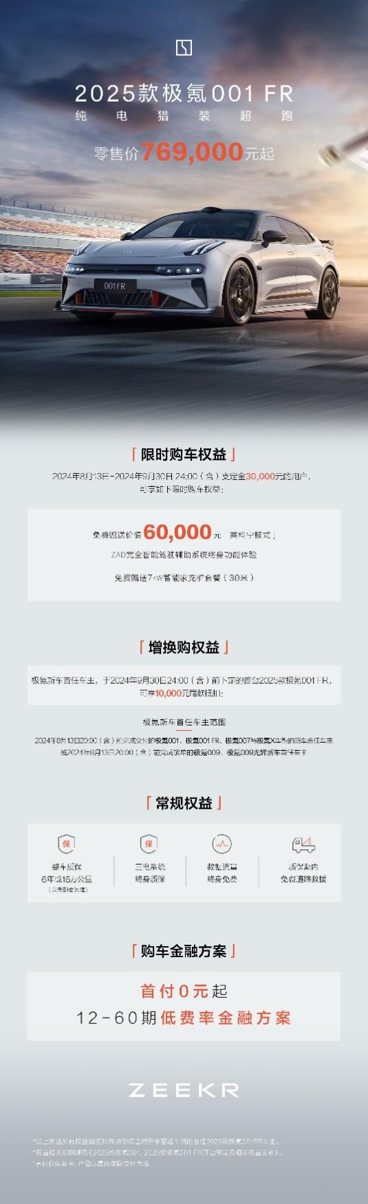 2025款极氪001FR购车权益:2024年8月13日到2024年9月30日24:00(含)支付定金30000元的用户可享限时购车权益;极氪新车首任车主,于2024年9月 30日24:00(含)前下定的首台2025款极氪001FR可享10000元尾款抵扣。