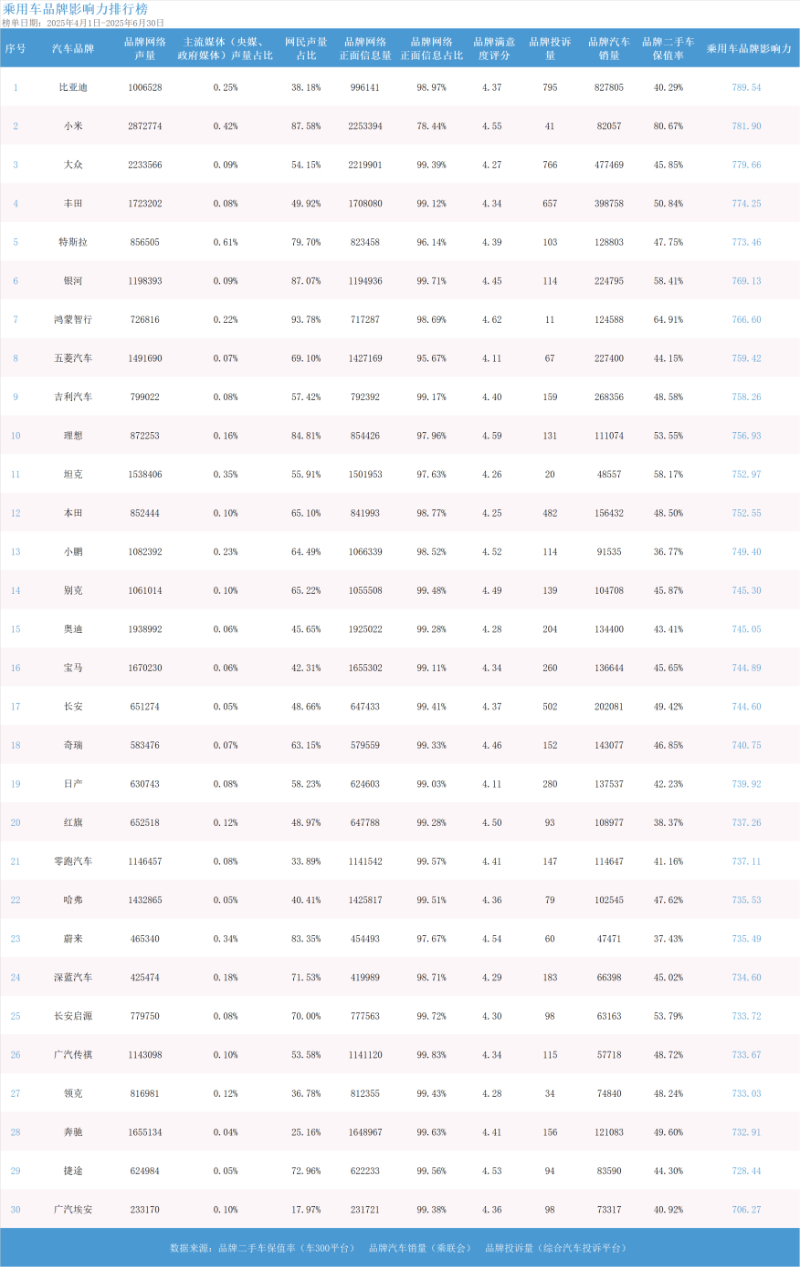 清博智能科技有限公司总裁郎清平表示,相比传统评估体系,该指数在电动化与智能化变革中新增三大差异化维度:其一,技术资产量化维度。乘用车模型增设“保值率”(20%权重),直接映射市场对三电技术、智能系统的长期信心;其二,用户体验精细化度量。美誉度拆解为双平台评分与投诉量逆向折算;商用车则强化“政企声量占比”,呼应政策导向型市场的合规需求。其三,动态竞争力追踪机制。季度数据可捕捉技术迭代对品牌格局的影响,例如二季度乘用车Top10中新能源/科技品牌席位从6家增至7家,揭示电动化研发投入正加速转化为影响力优势。