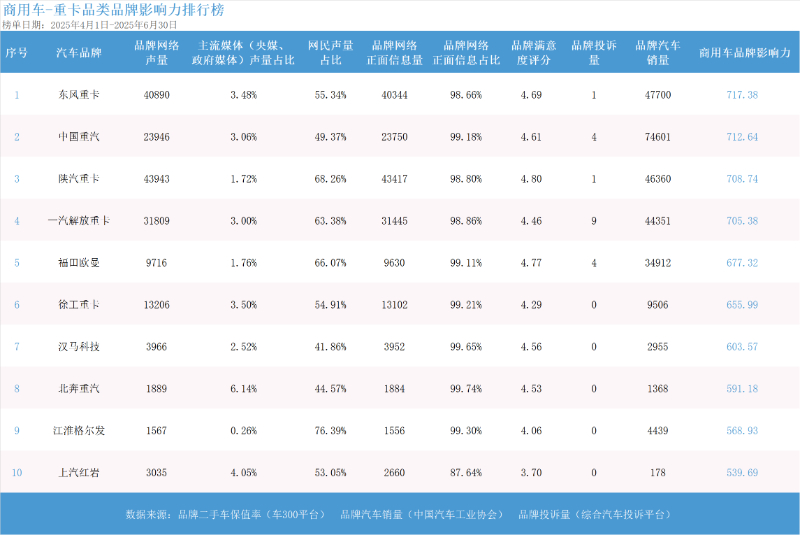 2025年第二季度商用车-重卡品类品牌影响力排行榜