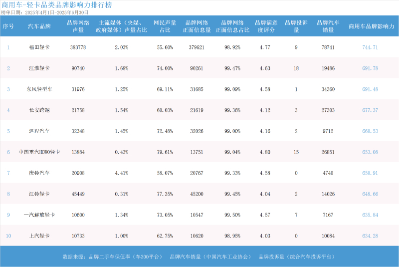 2025年第二季度商用车-轻卡品类品牌影响力排行榜