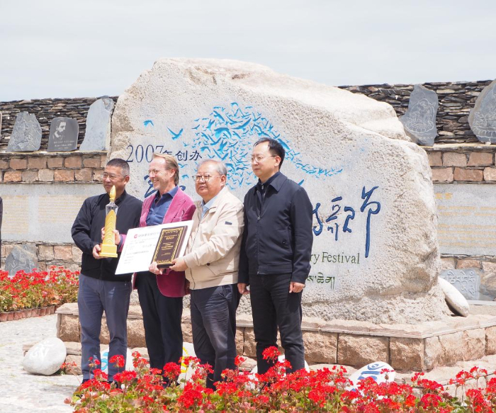 6月29日,吉狄马加(右二)为澳大利亚诗人马克·特雷尼克(左二)颁奖。新华社记者 白玛央措 摄
