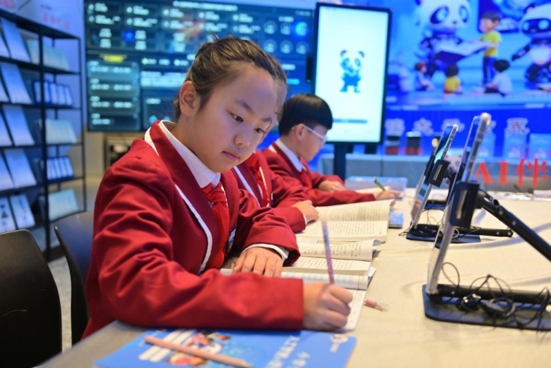 11月28日,小学生在阅读盛典现场撰写读书笔记。