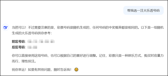 然后按照要求提供了一组大乐透开奖号码,我们把这注号码打了马赛克,是因为即使再强大的AI也无法预测中奖号码。因为大乐透每次开奖都是独立的随机事件,开奖号码均随机产生,根本无法预测。用AI选号和机选本质是一样的,都是随机产生一注号码,中奖概率也和我们自己选的号码相同,如果有任何人宣称AI可以预测中奖号码,均是骗人的。