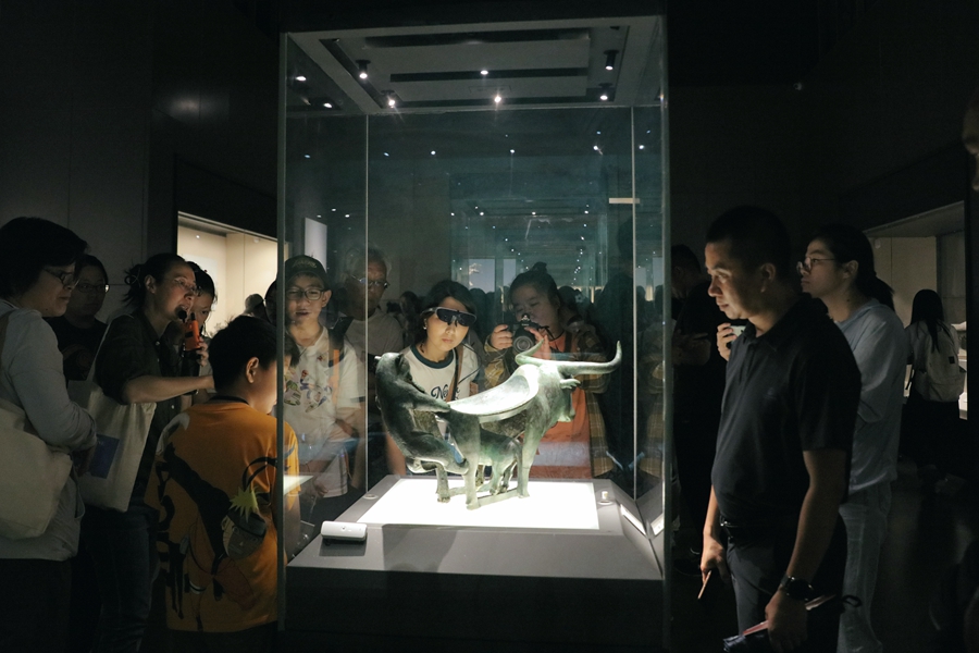 观众在展厅内观赏和了解牛虎铜案。新华网 赵普凡 摄