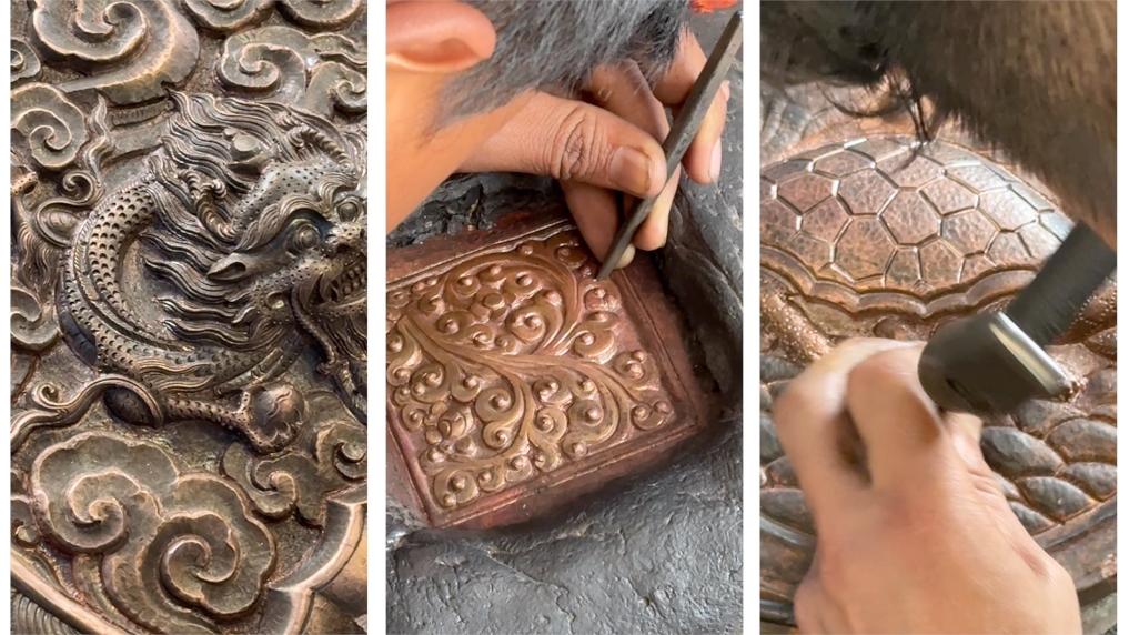 所谓锤揲法,是以铜片或金银板片为原料,使用铁臂、铁套、榔头、錾子等工具,敲打出浮雕纹样、各类造像、建筑装饰等,对工匠造型能力与经验要求很高。