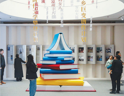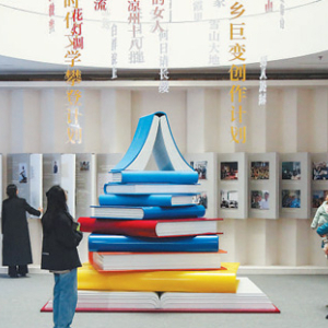 步入“歌以咏志星汉灿烂——新时代文学成就展”展厅,书山模样的艺术装置矗立展厅中央。