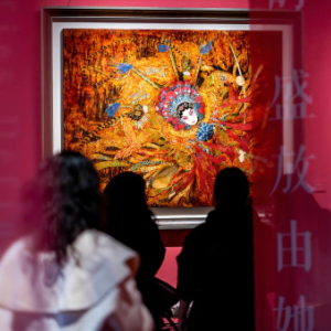 观众在福建省沈绍安漆艺博物馆里观赏女性题材的漆画作品(3月7日摄)。