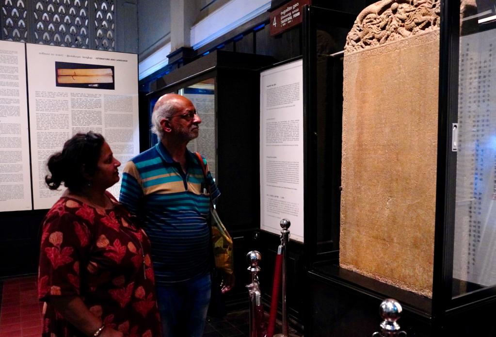 4月17日,在斯里兰卡科伦坡国家博物馆,观众参观郑和遗存《布施锡兰山佛寺碑》。新华社记者 伍岳 摄