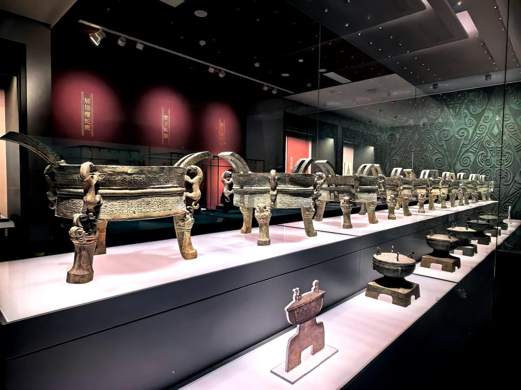除了“父子鼎”之外,安徽博物院在此次大展中,还首次展出了楚幽王陪葬器中的“九鼎八簋”。其中八簋包括了安徽博物院馆藏4件,与熊悍鼎一起从天津借展的2件,剩余两件以仿真展板“留白”。这套礼器被视为当时等级最高的礼器组合,在武王墩一号墓出土的“九鼎八簋八簠”尚未公开展出之前,这次大展让公众得以先行窥见先秦时期青铜礼制的最高等级是何等森严又富丽堂皇。