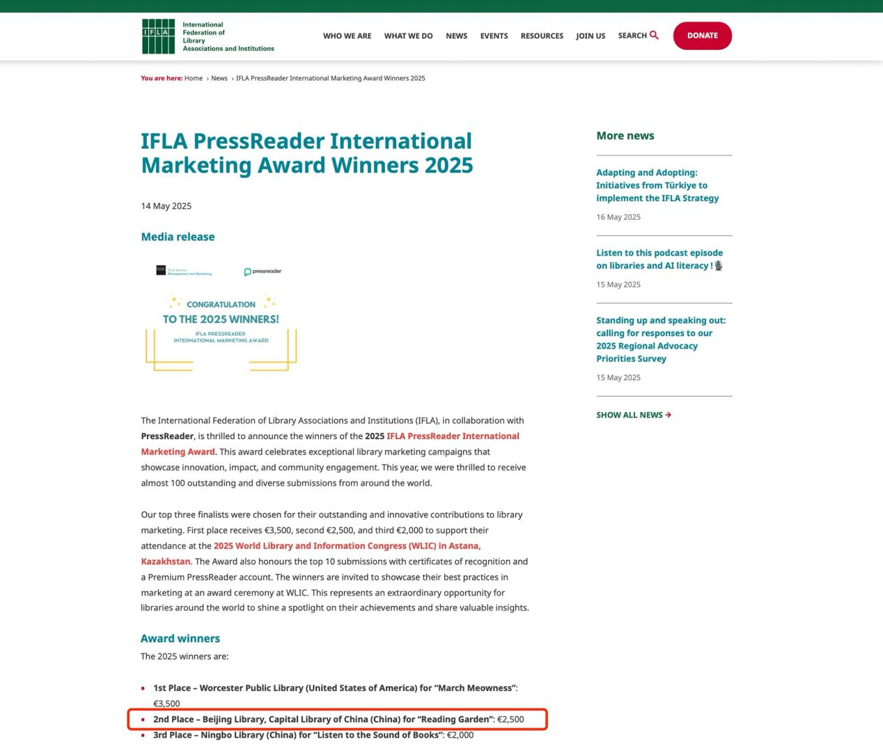 5月14日,国际图书馆协会联合会(IFLA)在官网发布2025年IFLA PressReader国际营销奖获奖名单。首都图书馆凭北京城市图书馆“阅读花园”项目(Reading Garden)从世界各地近100份优秀且多元的参赛作品中脱颖而出,荣获第二名。