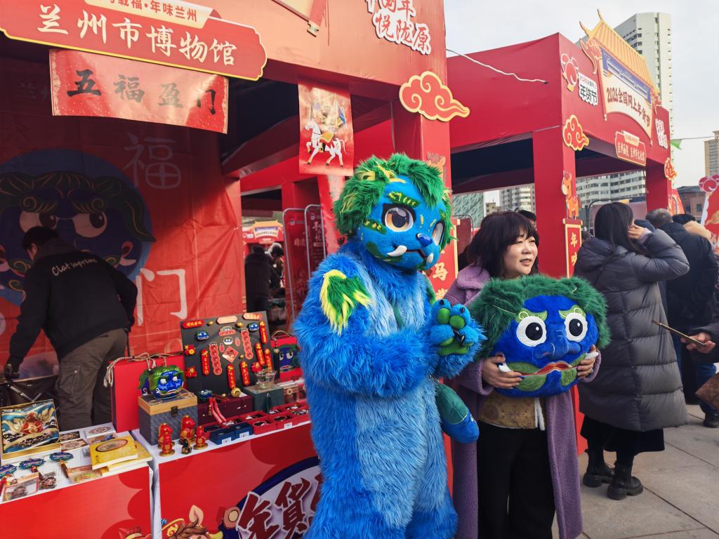 大集上的文创产品大受欢迎。在兰州市博物馆的展位前,人们被“兰小五”门狮系列文创产品和马年专属文创产品所吸引。