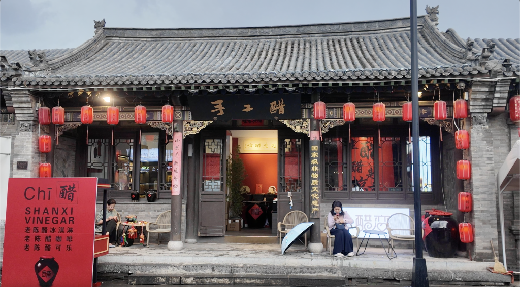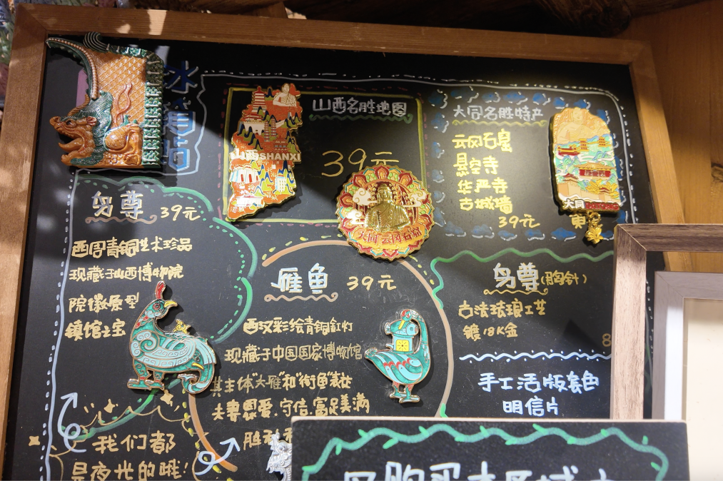 陈醋店的招牌产品是老陈醋冰激凌、老陈醋咖啡、老陈醋可乐,古色古香的杂货店里摆着各式各样以山西文物为原型的冰箱贴、小摆件,放着民谣的小酒馆,沙棘味的慕斯蛋糕……游客纷纷驻足拍照打卡,倍感新鲜。