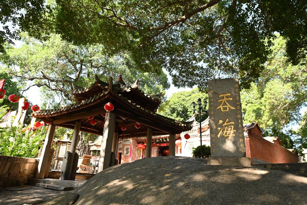 泉州市丰泽区真武庙前,一方巨石拱出地面、宛如龟背,上方石碑篆刻的“吞海”两个大字,彰显了泉州人征服大海的豪情。