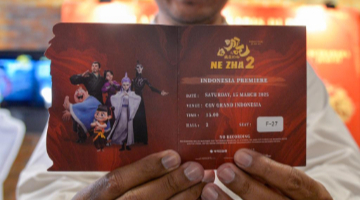 3月15日,在印度尼西亚雅加达,一名参加《哪吒之魔童闹海》首映礼的观众展示电影票。