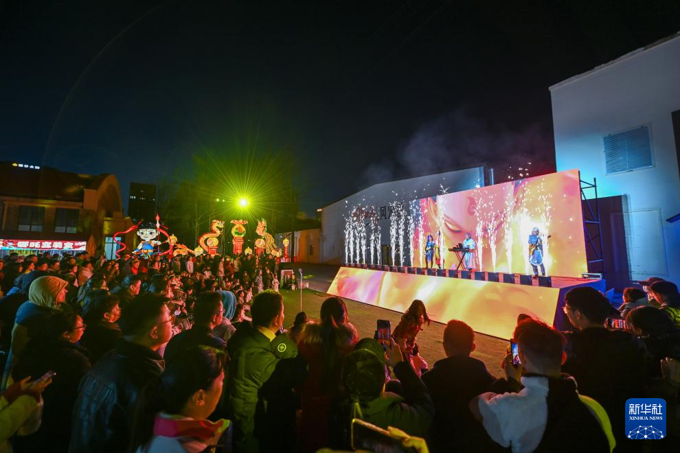 游客在天津哪吒小镇观看演出(3月16日摄)。