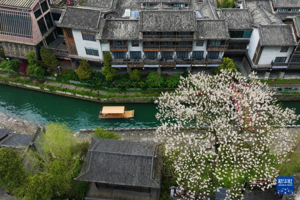 4月4日,游客在重庆市黔江区濯水古镇乘坐电动竹筏游览阿蓬江(无人机照片)。