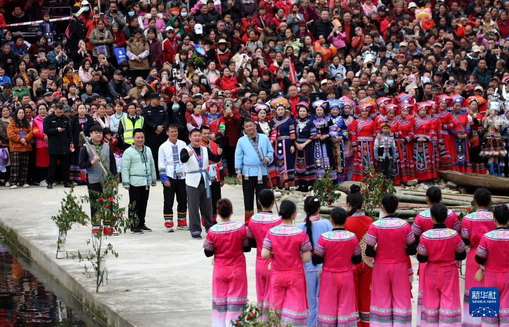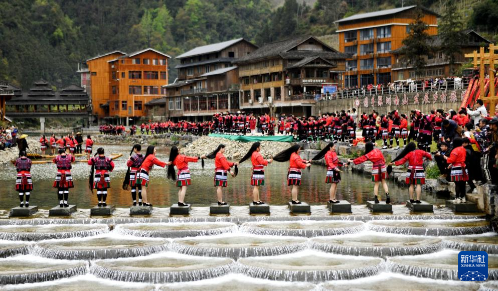 3月31日,人们在广西柳州市融水苗族自治县三防镇的“三月三”活动上跳竹竿。
