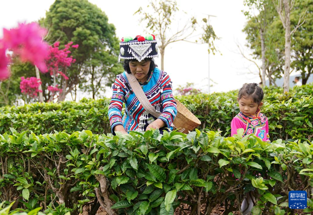 4月3日,在云南省宁洱县宁洱镇温泉村,茶农带着孩子在茶园采摘春茶。