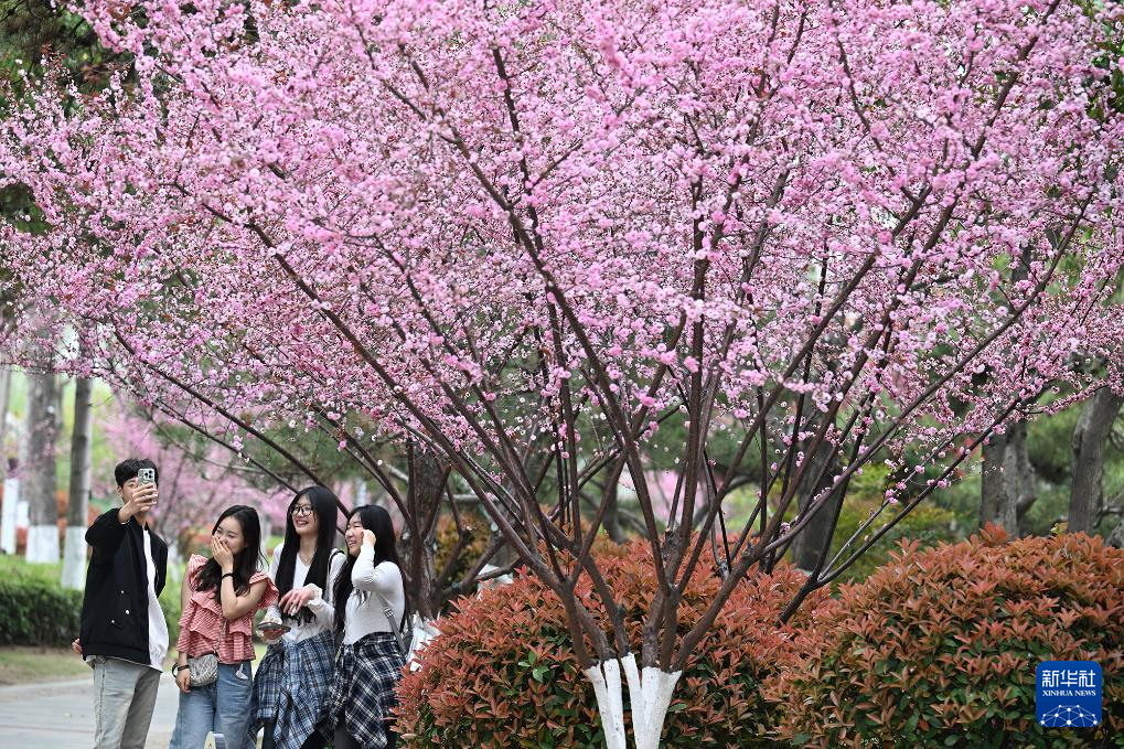 4月4日,游人在河南省商丘市日月湖景区拍照。